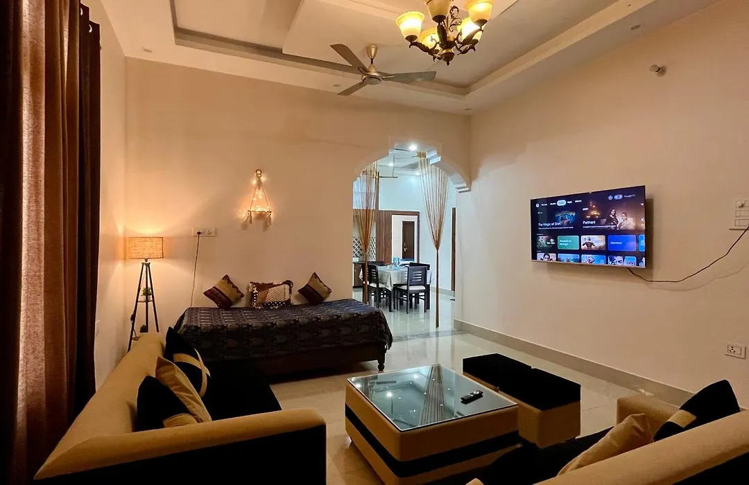 Media amenities at the Rishikesh villa including a flat-screen TV with satellite channels, are complemented by an air conditioner. The Rishikesh accommodation comes with a bathroom with a bidet, a bathtub, and a separate toilet. Slippers are included to enhance your comfort.